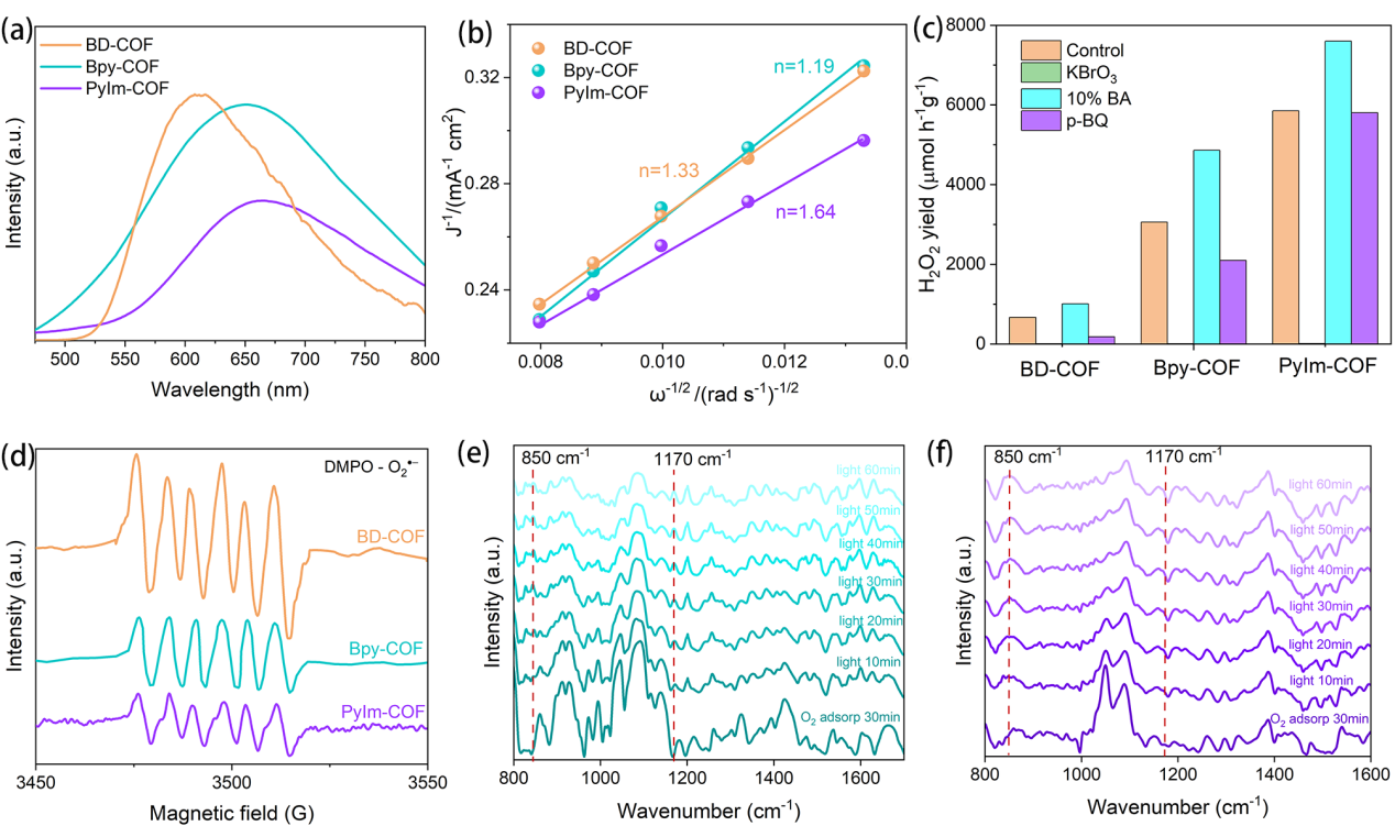 Figure3. (a) PL spectra and (b) TheKoutechy-Levich plots of BD-COF, Bpy-COF and PyIm-COF; (c) H2O2production of COF-based photocatalysts with different scavengers over one hour;(d) ESR spectra of COFs with DMPO as an electron-trapping agent; In situ DRIFTSspectra of (e) Bpy-COF and (f) PyIm-COF for H2O2production at 800-1600 cm-1.