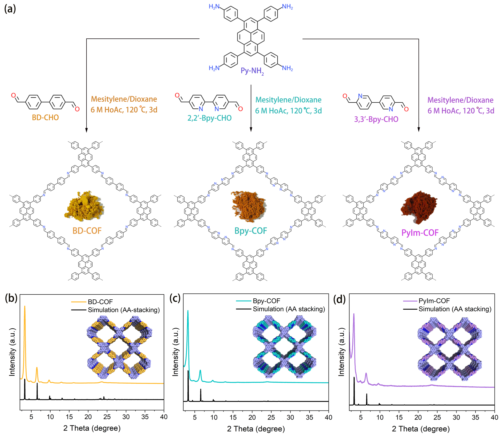 Figure 1.(a) Synthetic pathway of BD-COF, Bpy-COF, and PyIm-COF; PXRD patterns of (b)BD-COF, (c) Bpy-COF, and (d) PyIm-COF with experimental data and simulatedpatterns of eclipsed AA stacking mode; Insets are the modeled crystalstructures.