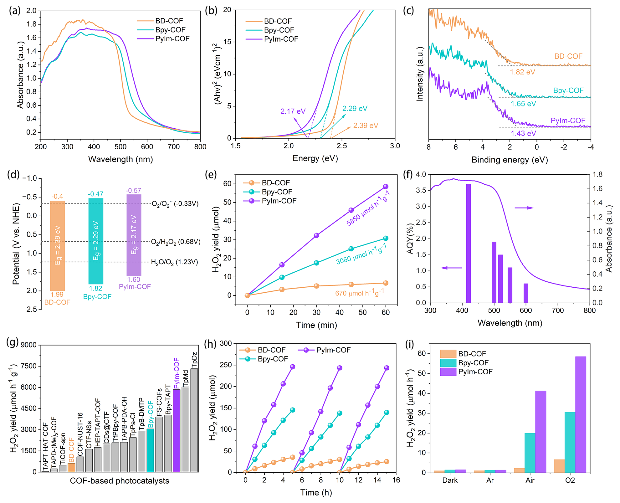 Figure2. (a) UV-vis DRS, (b) Tauc plot, (c)VB-XPS, and (d) Band structures of BD-COF, Bpy-COF, and PyIm-COF; (e)Time-dependent H2O2 photogeneration using visible lightfor BD-COF, Bpy-COF and PyIm-COF (10 mg catalyst in 50 mL water, λ>420 nm Xelamp); (f) AQY of PyIm-COF at selected wavelengths (420, 500, 520, 550 and 600nm).