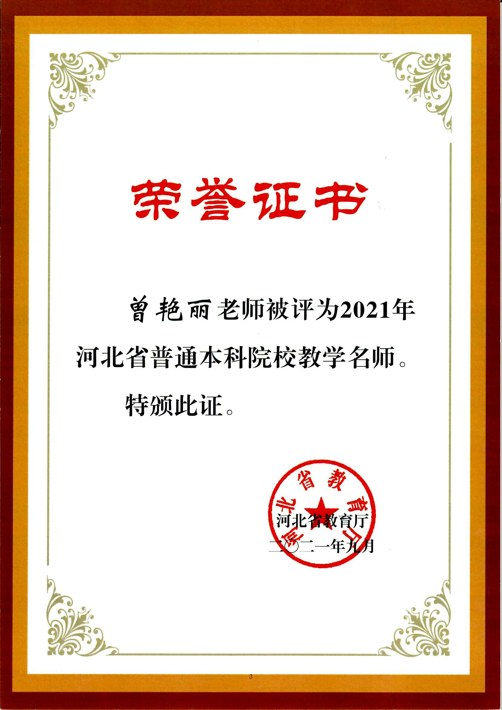 太阳城 曾艳丽教授被评为2021年河北省普通本科院校教学名师